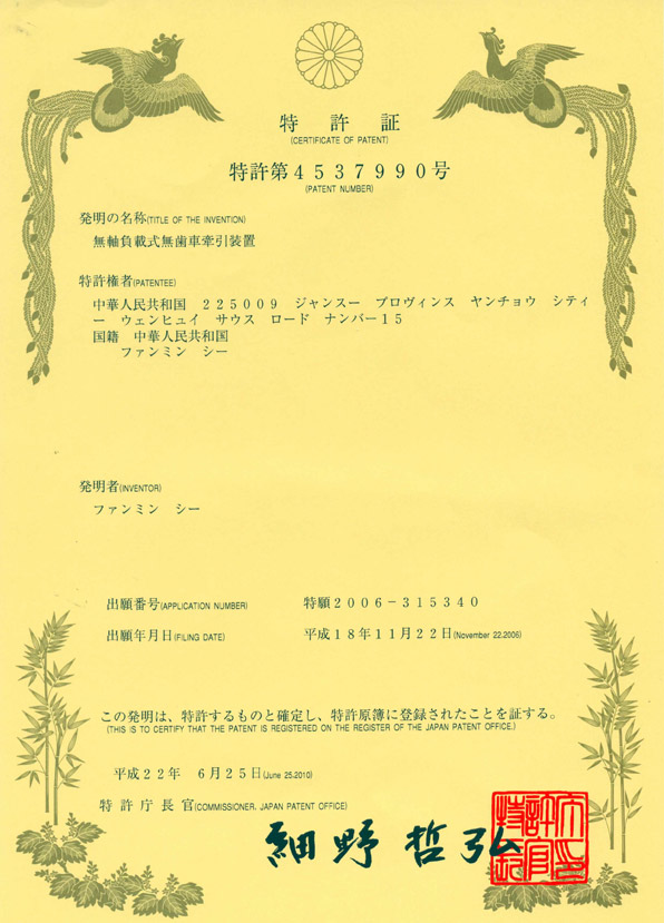 无轴负载 日本专利证书
