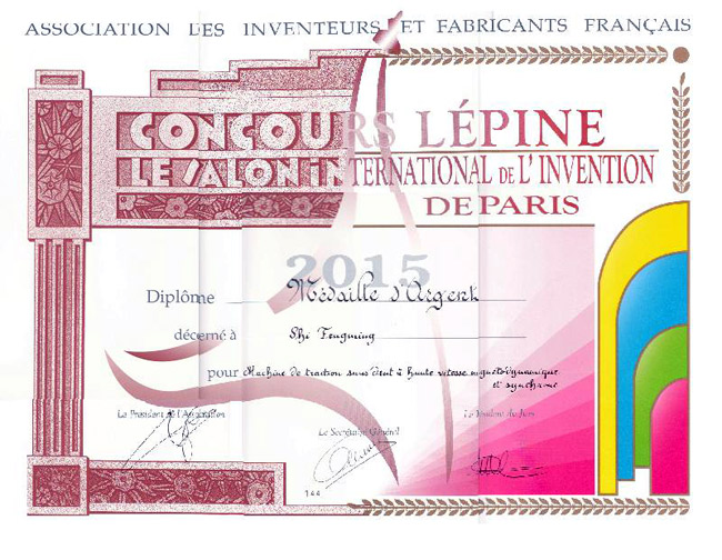 我公司"永磁同步高速无齿轮曳引机"发明专利技术荣获2015年巴黎国际发明展览会银奖